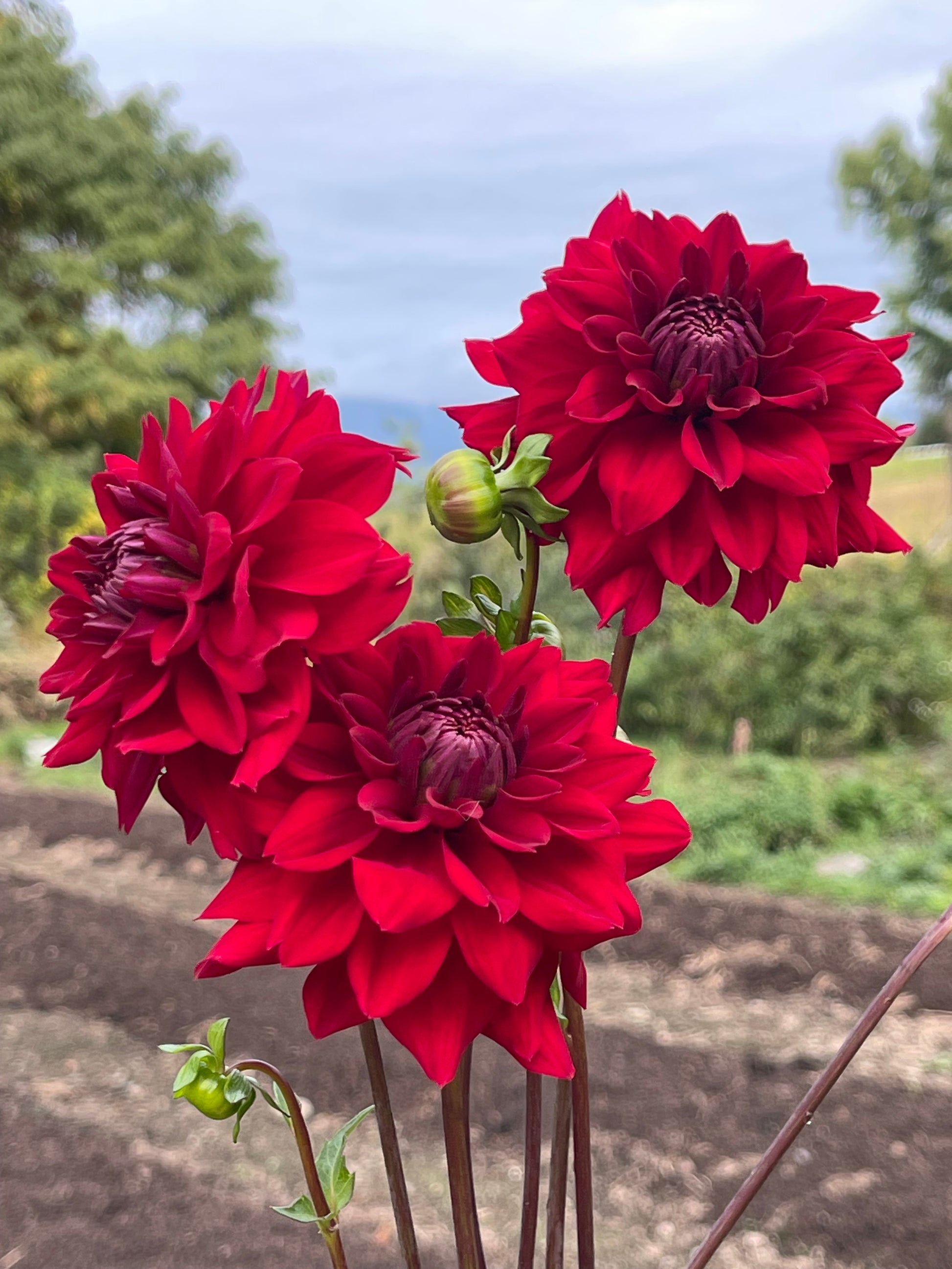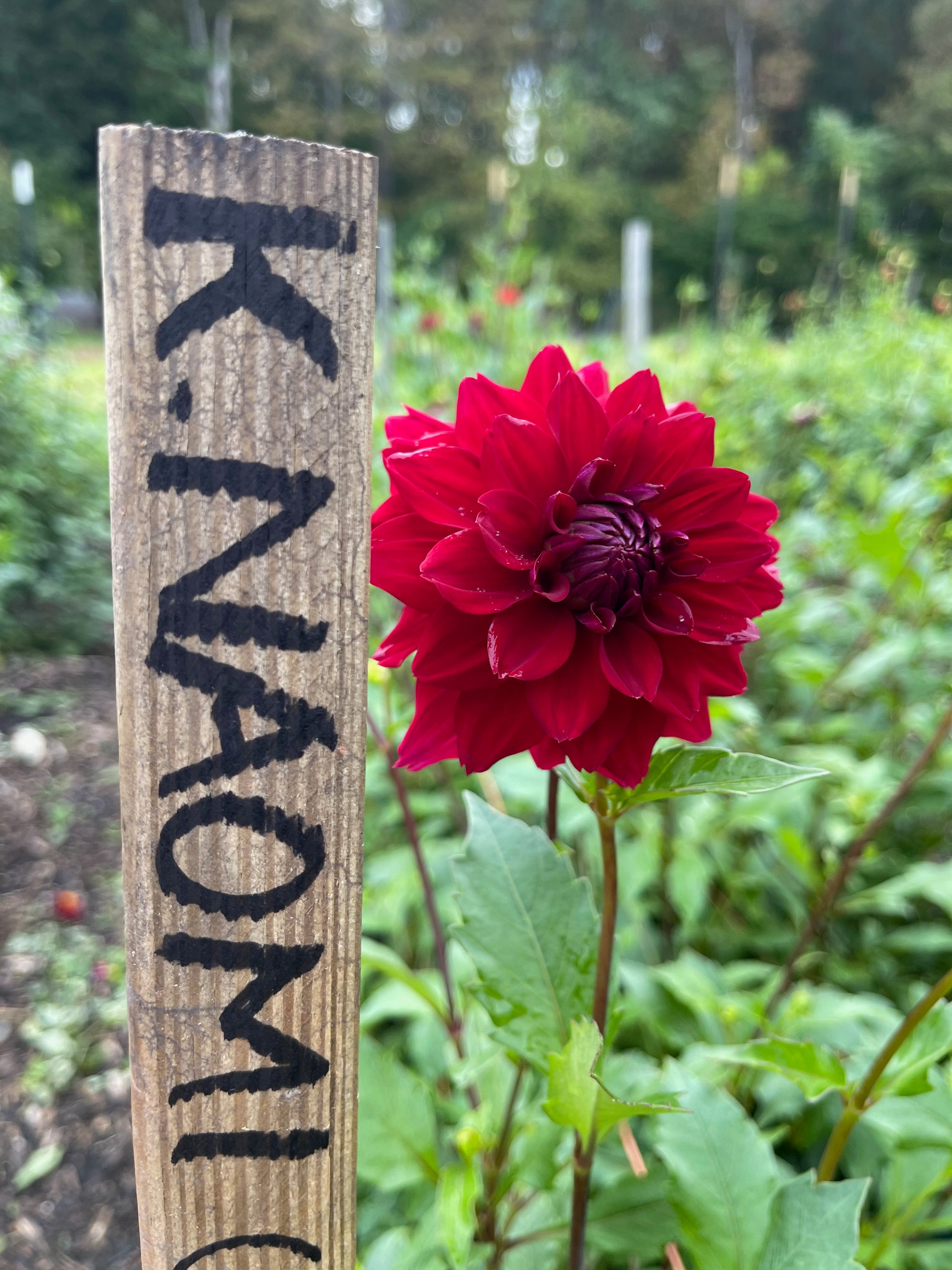 Another variety that I have lost the name of along the years, but it MIGHT be Karma Naomi. After all, it matches these descriptions I have found about the real K Naomi: “It is a burgundy decorative dahlia reminiscent of a glass of deep red wine” and “Beautifully formed flowers of rich, ruby red. The stems are very long and strong, making it an excellent cut flower.”