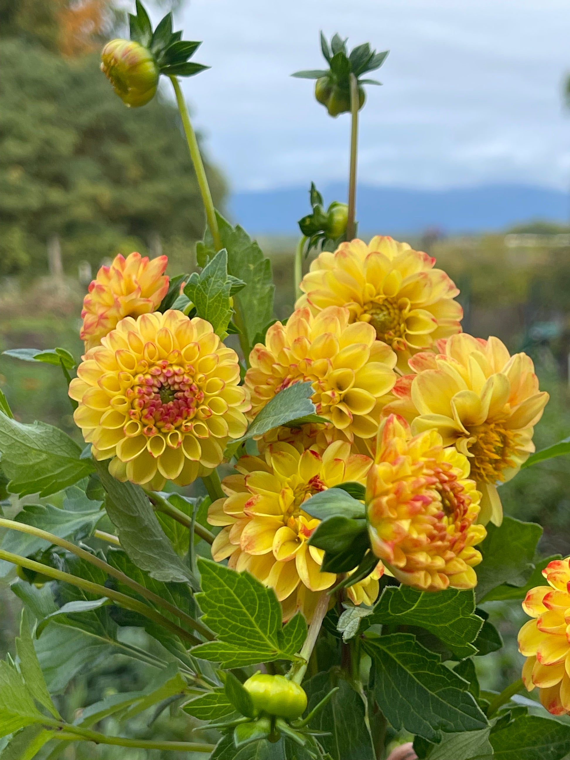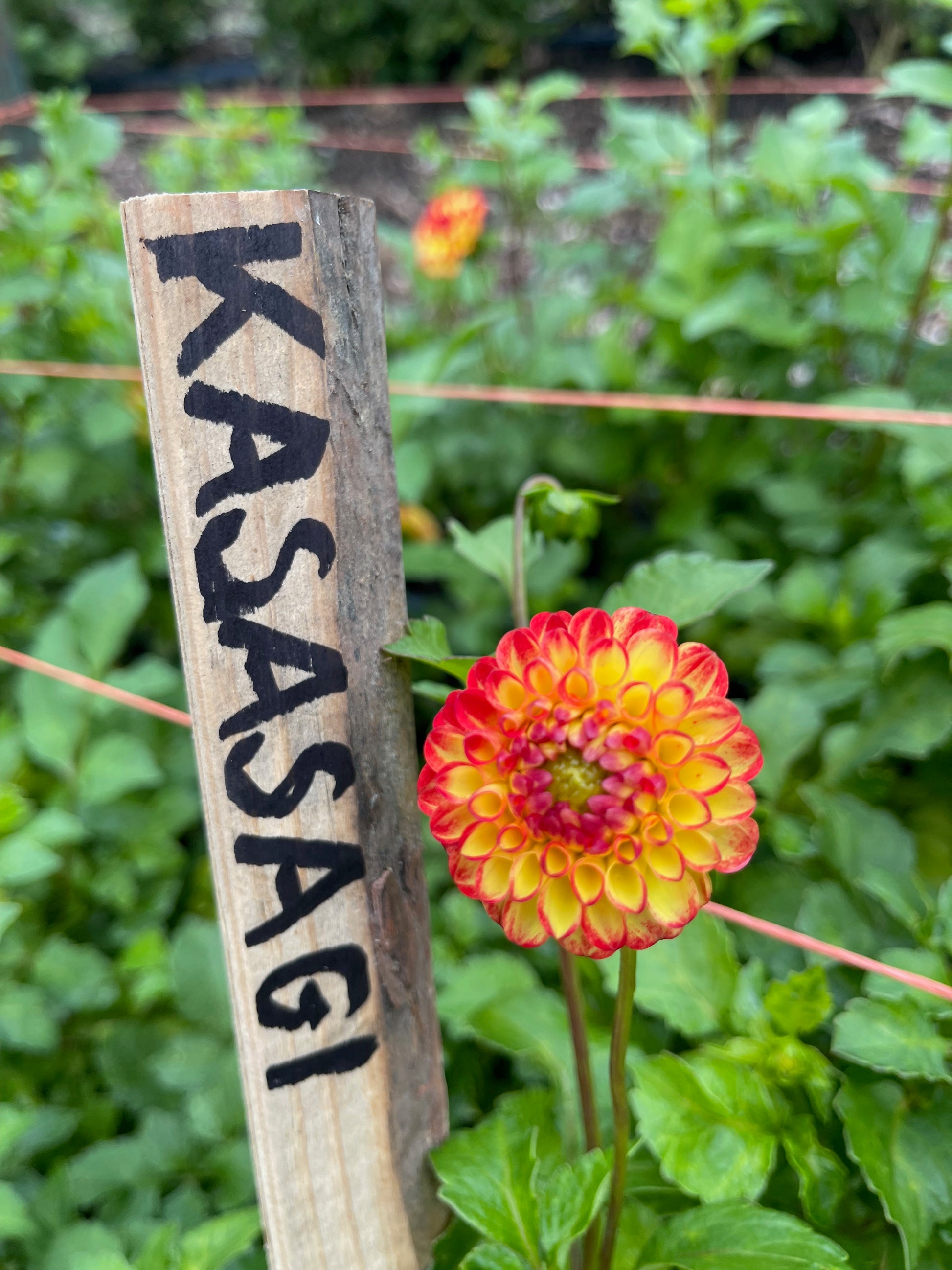 I cannot resist the pompoms. This adorable little yellow and red 2" pompom works well in arrangements, and produces useful stem length cuts if pinched back hard in the beginning. 3 1/2' plant