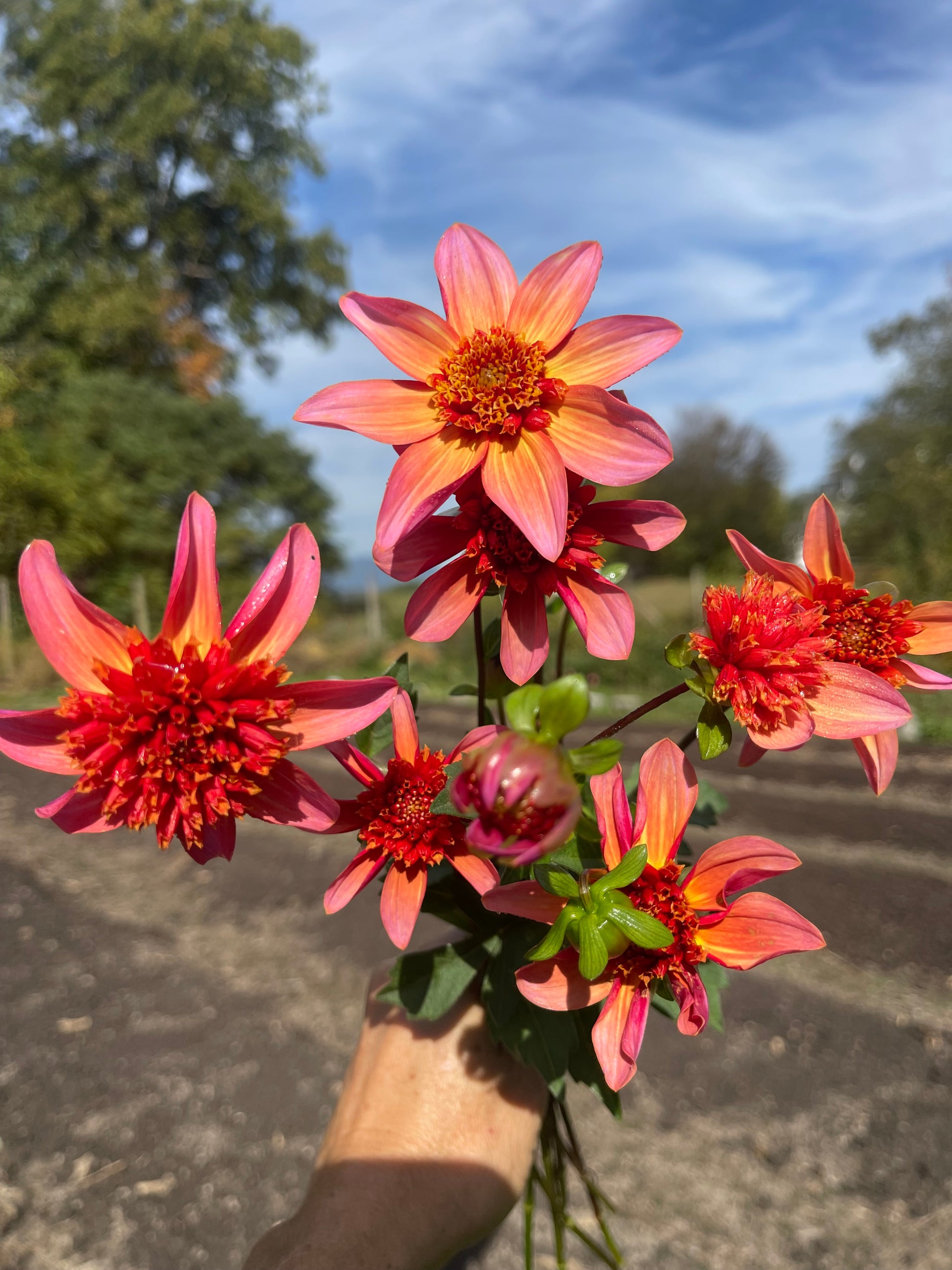 Anemone type that a burnt orange center and orange to magenta petals.